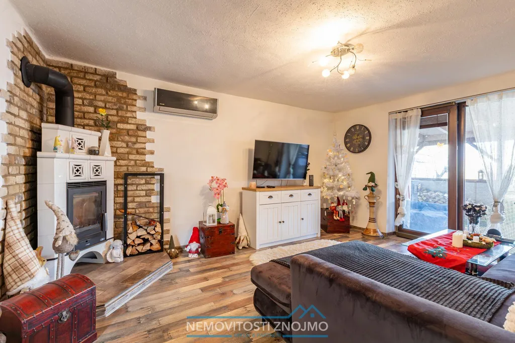 c.) obývací pokoj s krbovými kamny a vstupem na zasklenou terasu
