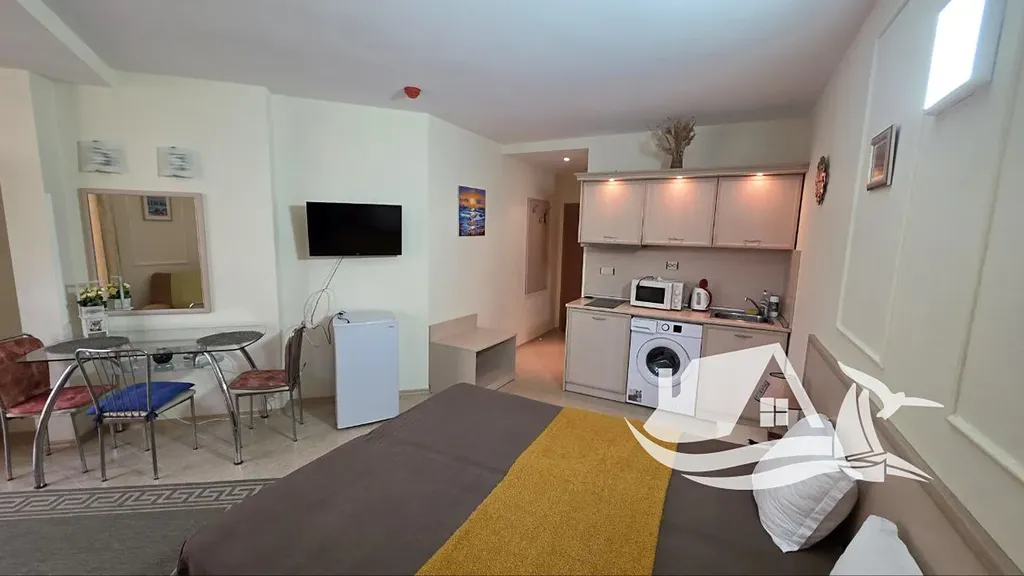 Představte si ráno, kdy otevřete dveře na balkon a měkké sluneční světlo se odráží od hladiny bazénu pod vámi. Vzduch je lehký, provoněný mořem a vzdálenými zvuky probouzejícího se letoviska. V takové chvíli máte pocit, že každý den může začít klidem a lehkostí. Přesně tak působí tento apartmán – jako útulné útočiště uprostřed Slunečné pobřeží, kam se budete rádi vracet.