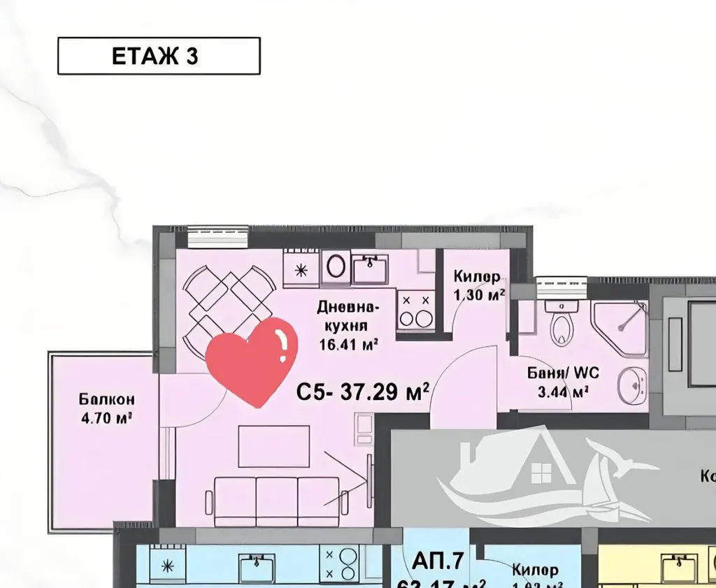 Interiér je tvořen obytnou místností s kuchyňským koutem, koupelnou a balkonem, který přirozeně rozšiřuje obytný prostor a nabízí místo pro klidné chvíle během dne i večera. Fotografie interiéru slouží pouze jako ilustrace. S dokončením i kompletním zařízením bytu vám rádi pomůžeme tak, aby výsledek odpovídal vašim představám i plánovanému využití.