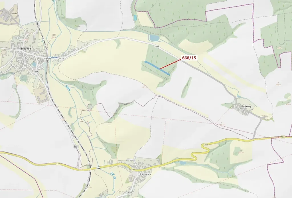 Lesní pozemek o výměře 4689 m2, parcelní číslo 668/15, podíl 1/1, katastrální území Milavče, obec Milavče, obec s rozšířenou působností Domažlice, okres Domažlice, Plzeňský kraj.