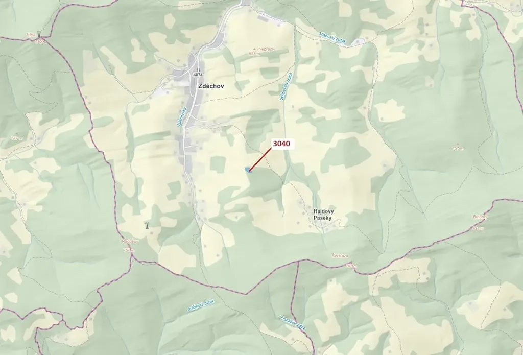 Lesní pozemek o výměře 2428 m2, parcelní číslo 3040, podíl 1/1, katastrální území Zděchov, obec Zděchov, obec s rozšířenou působností Vsetín, okres Vsetín, Zlínský kraj.