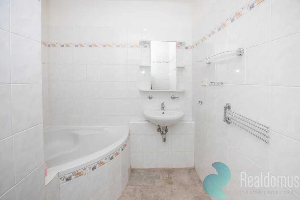 V koupelně se nachází WC, rohová vana, umyvadlo a pračka. K bytu náleží také sklep, který je ideálním prostorem pro uskladnění různých věcí a sezonních potřeb. Parkování je možné zdarma před domem.