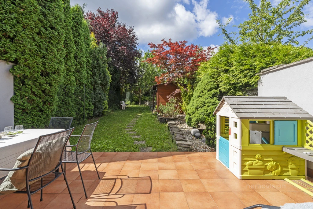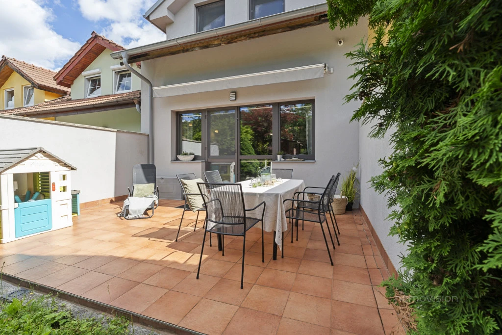 Součástí domu je příjemná terasa se zahradou, která poskytuje prostor pro relaxaci, dětské hry nebo letní grilování. Pozemek má celkovou výměru 252 m² a před domem se nachází praktické parkování na vlastním pozemku pod krytým přístřeškem.
