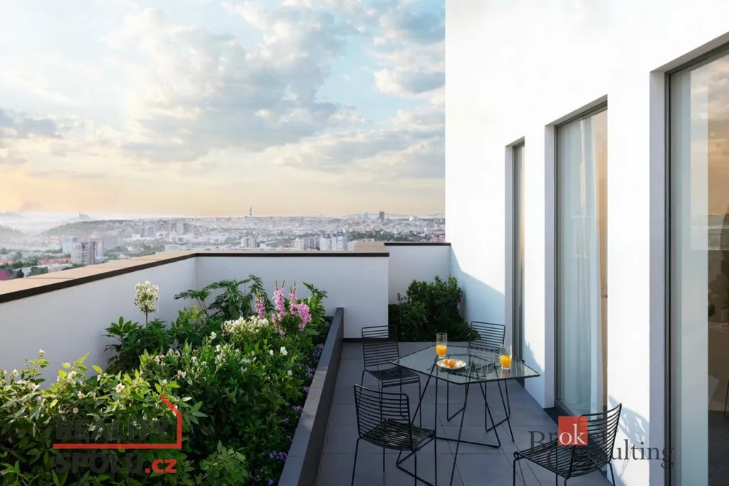 Byt vyniká panoramatickým výhledem na Prahu a dvojicí venkovních prostor:
