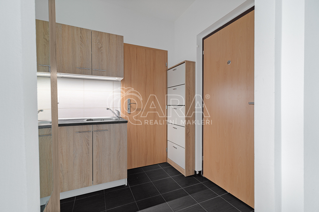 Díky umístění kuchyňské linky v chodbě získáváte plnohodnotný obývací pokoj a ložnici. Koupelna má sprchový kout a WC. Kuchyň je vybavená vším potřebným – nádobí, elektrický sporák s troubou i lednice s mrazákem. V ložnici je prostorná vestavěná skříň, kam se vejdou všechny vaše věci. V obýváku čeká televize se základním balíčkem programů. Pračka v koupelně a balkón v mezipatře vyřeší vaše praní.