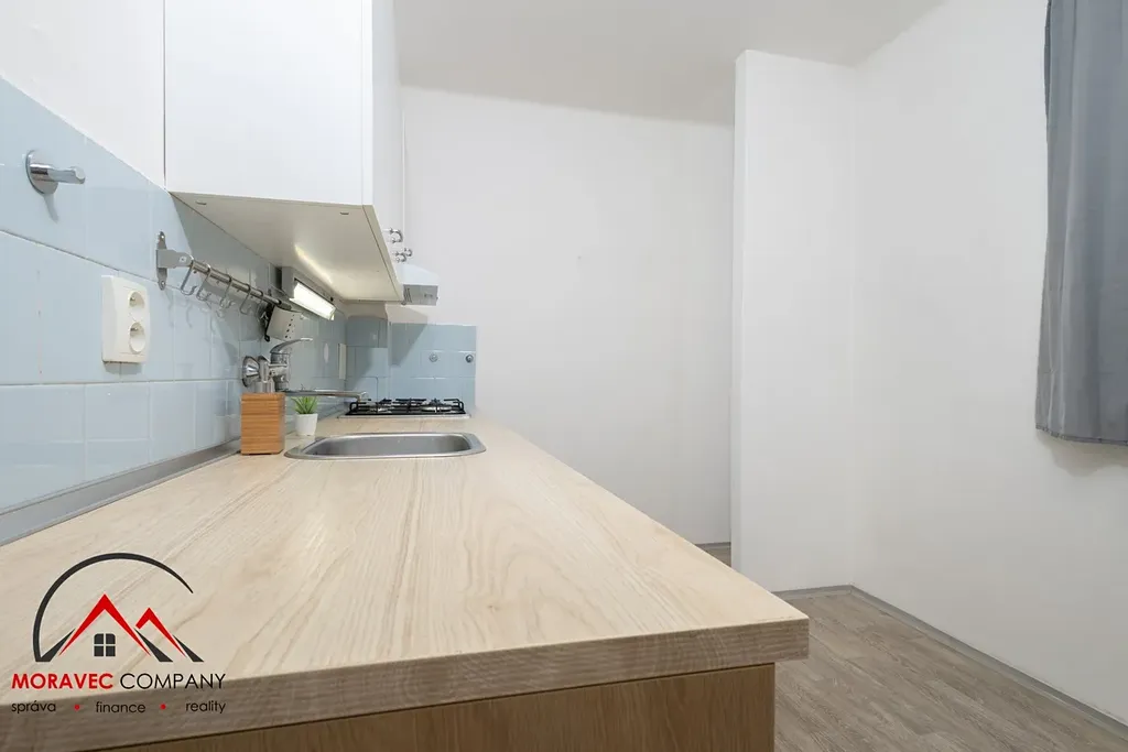 V bytě je kuchyně s kombinovaným sporákem, dále samostatný pokoj a koupelna s vanou, praktickými úložnými skříňkami a WC. Vytápění zajišťují plynové gamaty, ohřev vody je řešen elektrickým bojlerem.