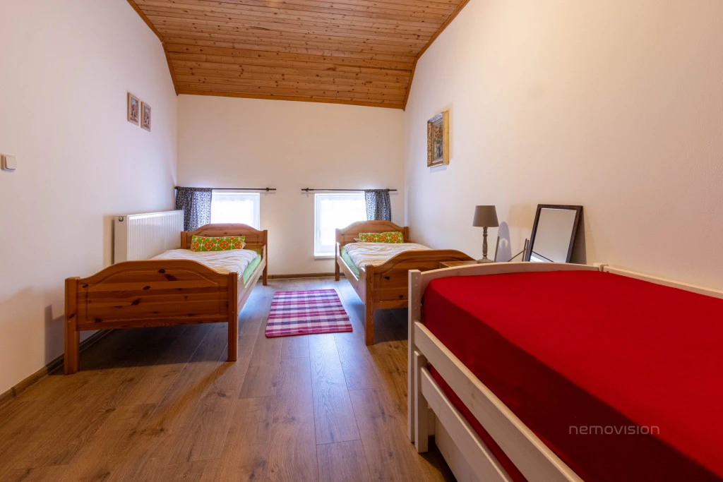 Objekt nabízí pohodlné ubytování pro 4 až 8 osob. V patře se nacházejí dvě průchozí ložnice s celkem pěti lůžky, v přízemí je společenská místnost s dalšími třemi lůžky. K dispozici je vybavená kuchyň, koupelna s vanou a toaletou v přízemí, další WC se nachází v patře. Chalupa je vytápěna plynovým kotlem, což umožňuje celoroční využití. Velkou výhodou je ovládání kotle na dálku, v zimě tak přijedete do vyhřátého domu. Zahrada nabízí příjemné posezení pod pergolou a možnost grilování. Velkým bonusem je stylový vinný sklípek přímo v objektu, který potěší nejen majitele, ale i případné návštěvníky.