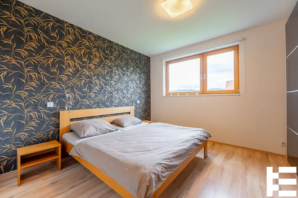 Zde Vás osloví otevřená část, která je využívána jako pracovna s velkými střešními okny, která celou plochu pracovny perfektně prosvětlí. Jedna z tří ložnic poskytuje nádherný výhled do údolí a Brdské hřebeny. Ložnice jsou samostatné s navazující menší místností, která slouží jako úložný prostor. Nechybí ani větší koupelna s rohovou vanou a toaletou.