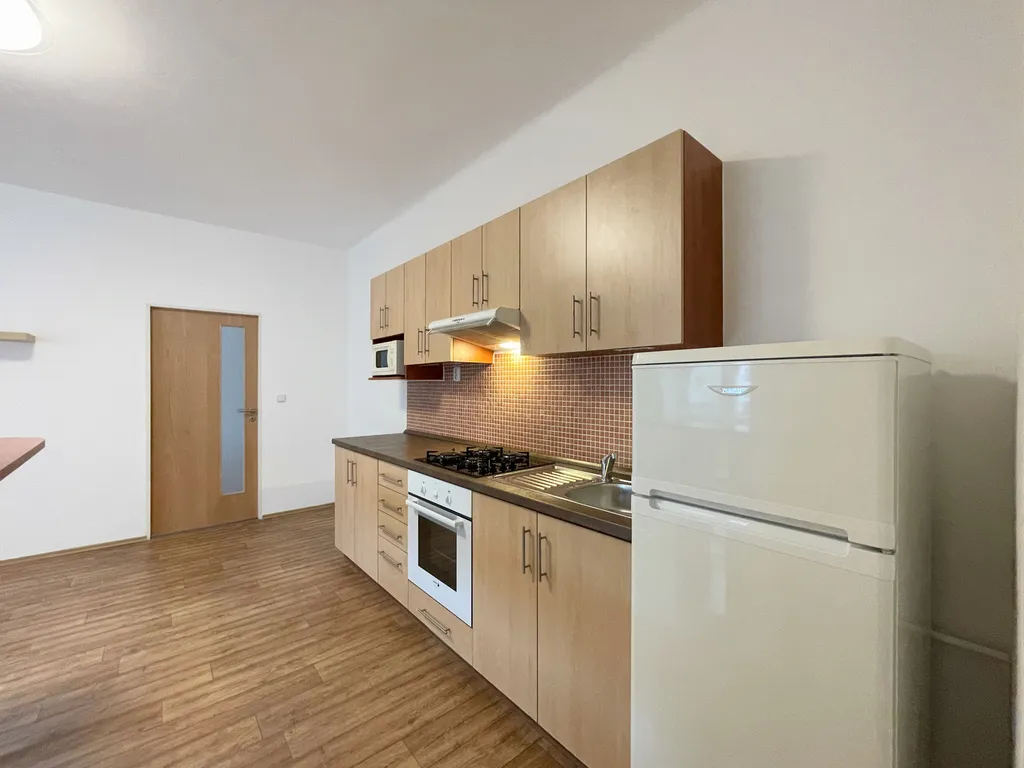 V chodbě narazíte na praktickou botníkovou stěnu se zrcadlem, kam pohodlně odložíte své věci při příchodu do bytu. Obývací pokoj je propojený s kuchyňským koutem a jeho součástí je barový pult se dvěma židlemi – ideální na rychlou snídani, kávu nebo večerní drink. Samozřejmě lze pult snadno odstranit, pokud preferujete více prostoru. Kuchyň je vybavena lednicí, elektrickou troubou s plynovými hořáky, takže vaření i pečení je radost. Velkou výhodou je klimatizace, která v letních měsících příjemně vychladí celý prostor a na podzim vás naopak potěší teplý a útulný večer. Ložnice je vybavena skříní pro vaše oblečení a osobní věci, a díky orientaci oken na východ vás ráno čeká jemné sluneční světlo.