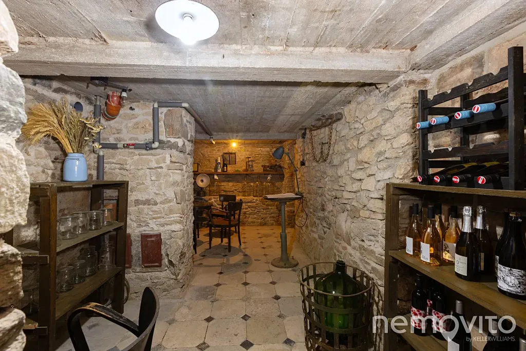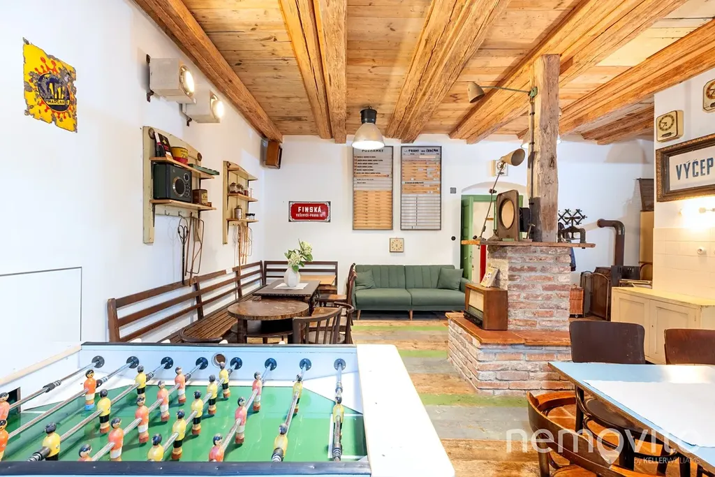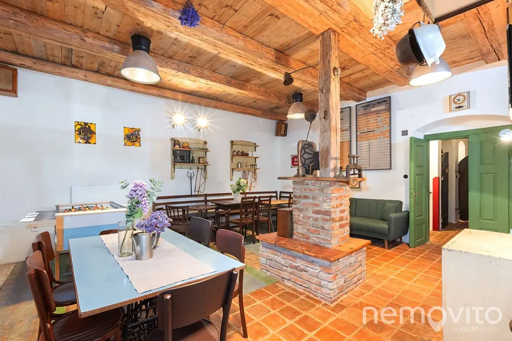 Hlavní část prvního podlaží tvoří velká společenská místnost s vysokým stropem. Její plocha je 65 m2 a kapacitně je s penzionem řešena tak, aby pohodlně pojmula 25 hostů. V hlavní místnosti je jídelní, kuchyňská a společenská část. Dřevo, cihly, kamna, původní okna a dveře - vše tak jak má být, pokud vy nebo vaši hosté hledají prostor, kde by se poctivá atmosféra starých časů dala i krájet. Nebo popíjet, což ostatně umožňuje malý vinný sklípek pod domem.