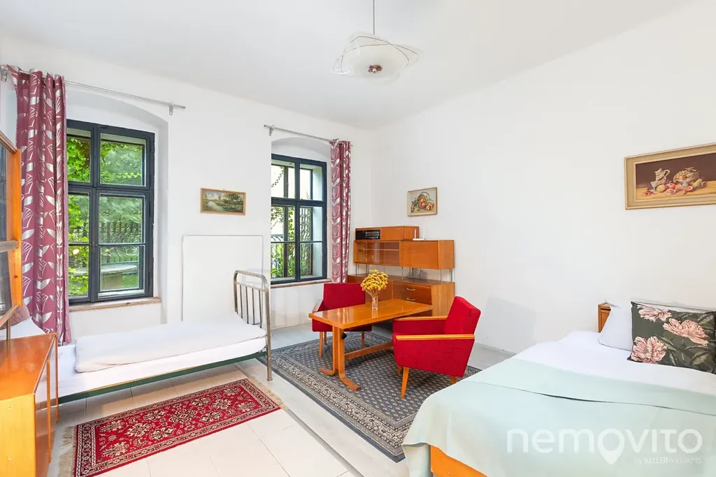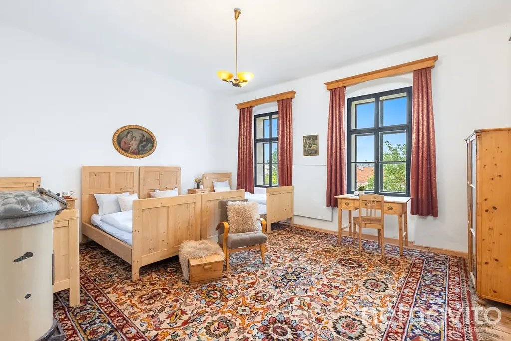 Pokoje jsou tematické, a tak tu naleznete zámecká apartmá, největší "prezidentský" pokoj (Zbraslavice jsou blízko Vysočině, ale ne zas tak moc), socialistický pokoj vhodný k plánování vašeho hospodářství nebo část domu, která je vhodná pro využití k bydlení - dva pokoje z vlastní koupelnou a kuchyní. Koupelny jsou v domě celkem 3, kuchyně mimo zmíněné pak ještě dole ve společenské. Pokoje mají od 16 do 36 m2.