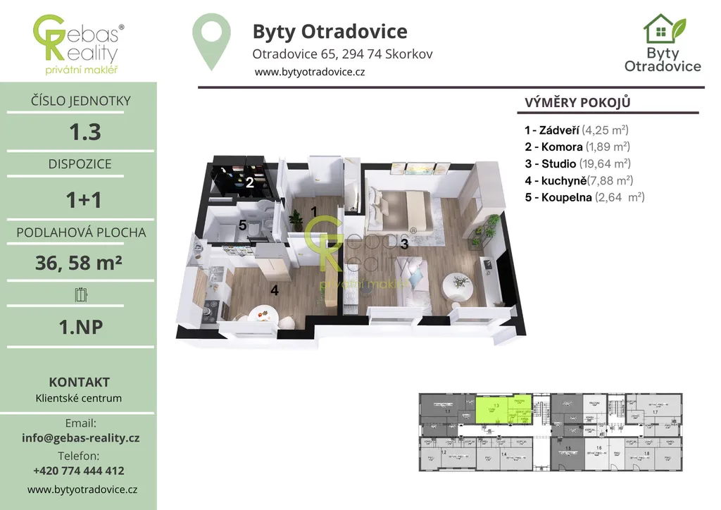 Ve výhradním zastoupení si Vás dovolujeme oslovit nabídkou moderní bytové jednotky o dispozici 1+1 a celkové užitné ploše 38,4m², která se nachází v kompletně zrekonstruovaném bytovém domě v obci Otradovice – Skorkov pouhých 5 minut od Brandýsa nad Labem – Staré Boleslavi. Projekt Byty Otradovice zahrnuje celkem 16 bytových jednotek různých velikostí a nabízí kvalitní a komfortní bydlení v klidné lokalitě s výbornou dostupností do Prahy, Brandýsa nad Labem – Staré Boleslavi i Mladé Boleslavi. Součástí kupní ceny je parkovací stání před domem, kuchyňská linka vyrobená na míru od truhláře včetně vestavných spotřebičů, kompletní sanita v koupelně značky JIKA a zděný sklep o minimální ploše 15 m² umístěný v suterénu domu.