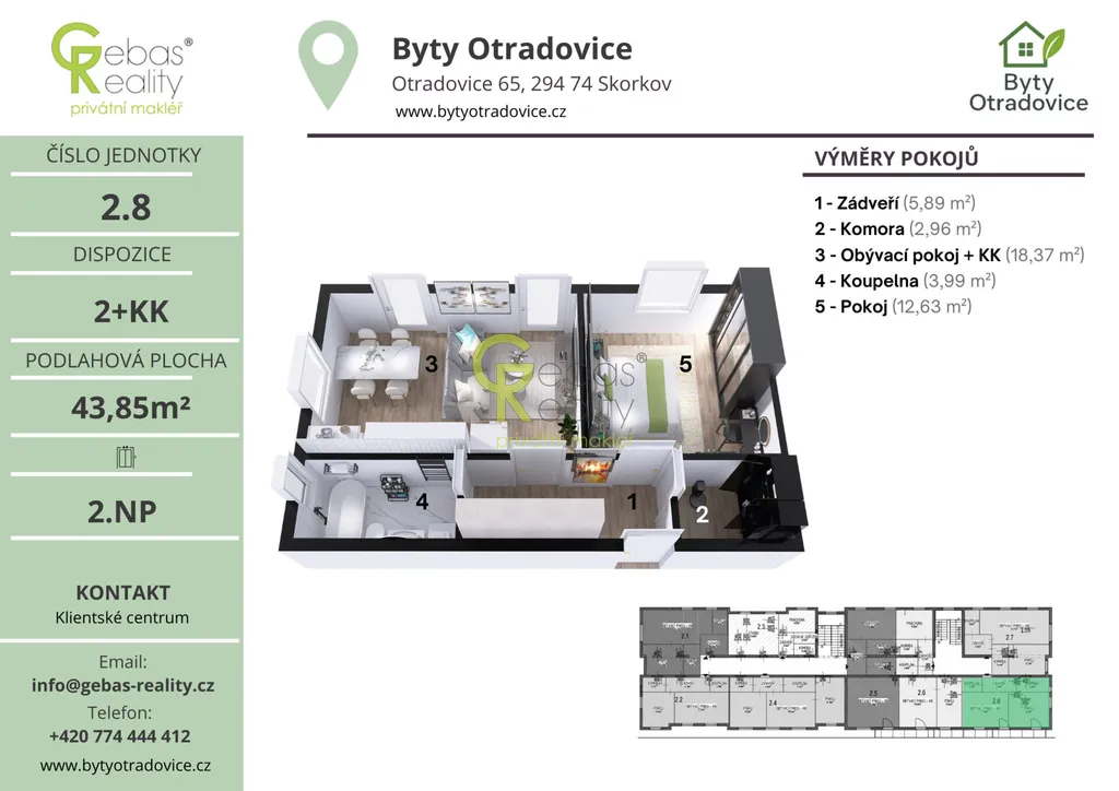 Ve výhradním zastoupení si Vás dovolujeme oslovit nabídkou moderní bytové jednotky o dispozici 2+KK a celkové užitné ploše 45,6 m², která se nachází v kompletně zrekonstruovaném bytovém domě v obci Otradovice – Skorkov pouhých 5 minut od Brandýsa nad Labem – Staré Boleslavi. Projekt Byty Otradovice zahrnuje celkem 16 bytových jednotek různých velikostí a nabízí kvalitní a komfortní bydlení v klidné lokalitě s výbornou dostupností do Prahy, Brandýsa nad Labem – Staré Boleslavi i Mladé Boleslavi. Součástí kupní ceny je parkovací stání před domem, kuchyňská linka vyrobená na míru od truhláře včetně vestavných spotřebičů, kompletní sanita v koupelně značky JIKA a zděný sklep o minimální ploše 15 m² umístěný v suterénu domu.