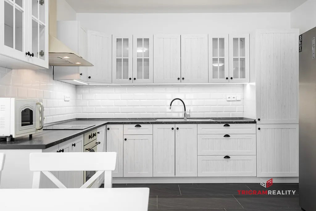 Je zde nová kuchyňská linka s vestavěnými spotřebiči (kromě myčky nádobí), a prostorná americká lednice.