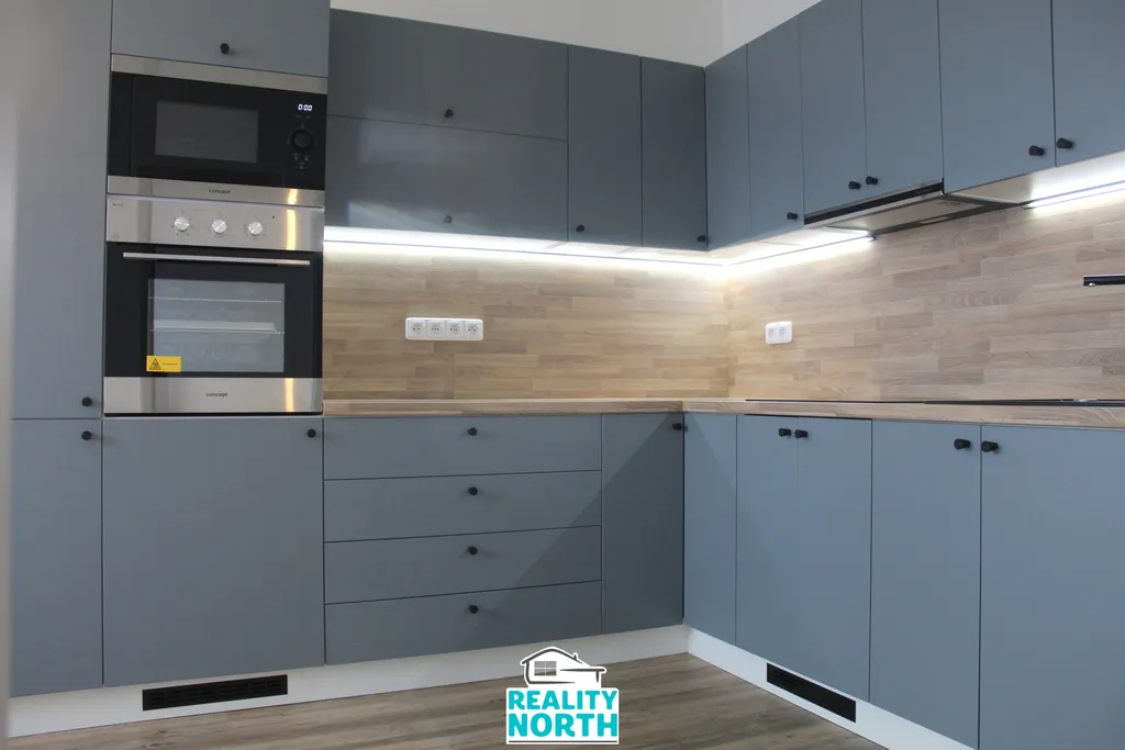 Nová kuchyňská linka s vestavěnými spotřebiči- elektrická trouba, indukční deska, mikrovlnná trouba, myčka.