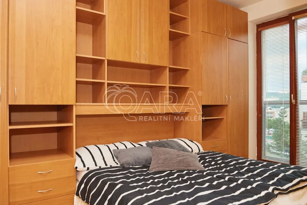 Ze vstupní chodby, kde nalezneme šatní skříň a botník, vcházíme do prostorného obývacího pokoje s kuchyňským koutem. V místnosti je pohodlná sedací souprava, jídelní stůl, obývací stěna s TV a wifi routerem. V kuchyňském koutu je plně vybavené kuchyňská linka (lednice, mrazák, myčka, mikrovlnná trouba atd.). Z obytné místnosti vcházíme do ložnice s manželskou postelí s mnoha úložnými prostory na stěně za postelí. Přímo na ložnici navazuje samostatná prostorná koupelna s vanou a pračkou. Dostatek světla a slunce zajistí v obou místnostech velká francouzská okna, která jsou orientována na jih.