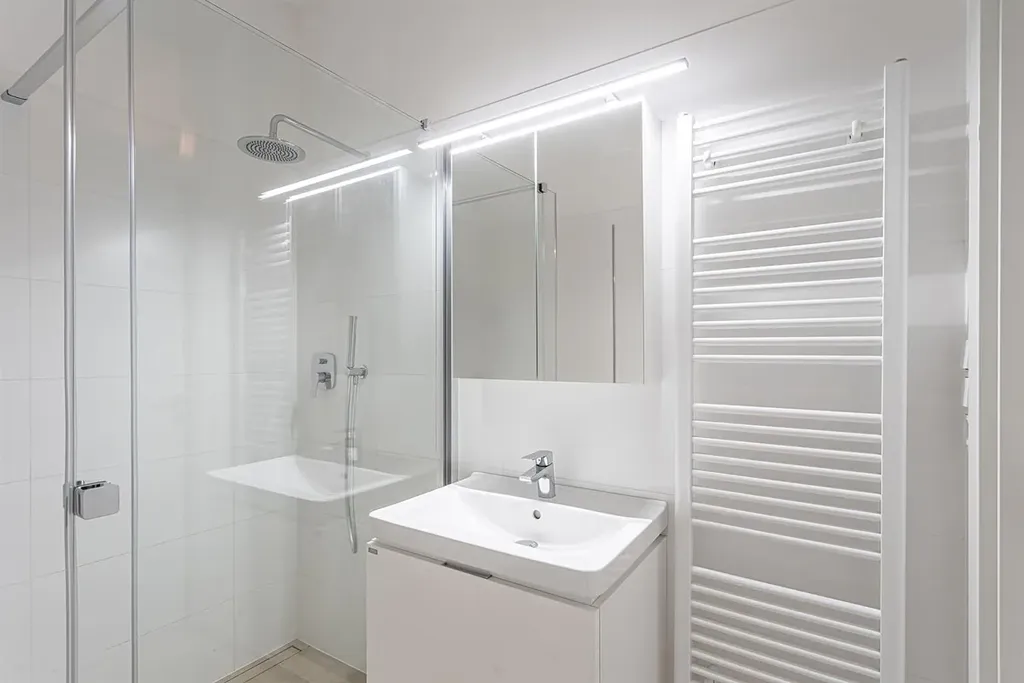 Interiér bytu je nezařízený (možnost vybavení nábytkem za vyšší nájem dle domluvy). Dispozičně prostor nabízí vstupní chodbu, prostorný, světlý obývací pokoj s vybavenou kuchyní s vestavěnými spotřebiči (lednice s mrazákem, varná deska, trouba, myčka), 2 samostatné prostorné ložnice, 2 koupelny jedna s vanou a toaletou a druha se sprchovým koutem a toaletou. V bytě je dále komora s pračkou a k bytu náleží také sklep.