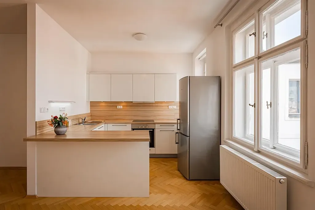 Reprezentativní prostorný byt po rekonstrukci o dispozici 2+kk, s obytnou plochou 73m2, je situovaný v 5.patře reprezentativní budovy s výtahem, v lukrativní lokalitě na Praze 1 Staré Město. Interiér bytu je nezařízený a nabízí velkolepé světlé pokoje s vysokými stropy, dispozičně se sestává ze vstupní chodby s dostatkem úložných prostor v podobě prostorných skříní, se vstupem do obývacího pokoje spojeného s moderní plně zařízenou kuchyní (sporák/trouba, lednice/mrazák, myčka, mikrovlnná trouba), dále navazuje vstup do světlé ložnice vybavené prostornou šatní skříní. Z chodby je vstup do koupelny s vanou, bidetem a toaletou, a další oddělené toalety. Podlahy tvoří kvalitní parkety a dlažba.