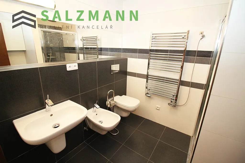 - koupelna s WC – sprchový kout, umyvadlo, bidet, zrcadlo, otopný žebřík, místo na pračku