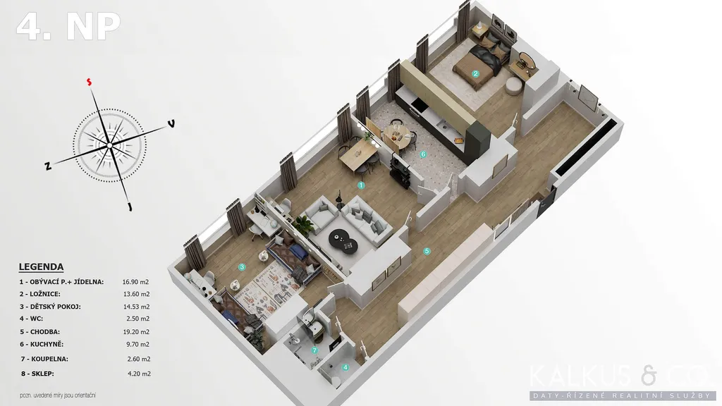 obývací pokoj + jídelna: cca 16,9 m² – nabízí se varianta propojení s kuchyní;