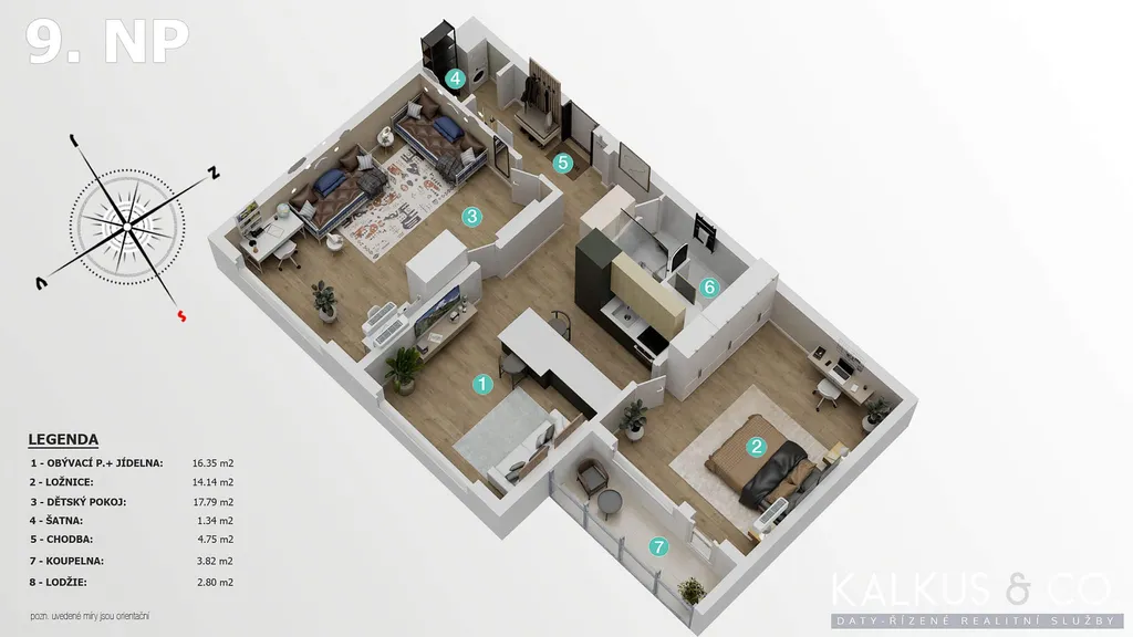 Byt je po částečné rekonstrukci ve velmi dobře udržovaném stavu. V centru dění se nachází obývací pokoj společný s novou kuchyňskou linkou a jídelnou (cca 16.35 m²). Po stranách obývacího pokoje je dětský pokoj (cca 17.79 m²) a ložnice (14.14 m²) s lodžií. V původním jádře je koupelna se sprchovým koutem společná s WC.
