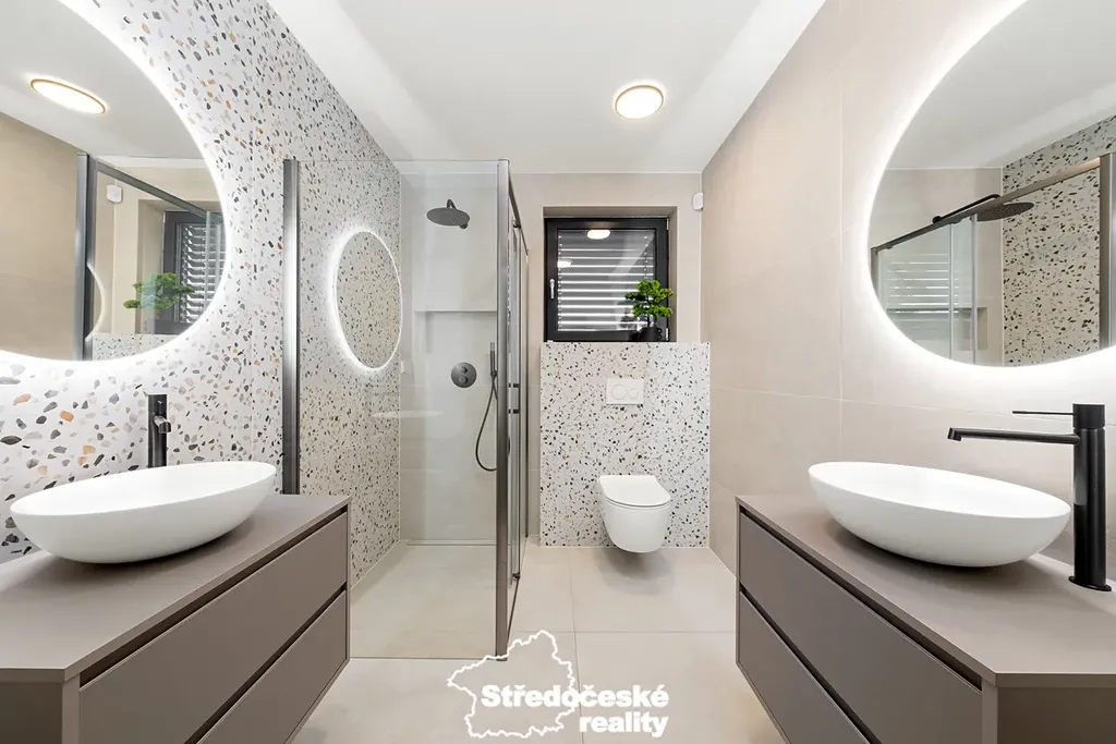 V interiéru jsou použity kvalitní materiály – italská keramika, prémiová sanita a moderní detaily.
