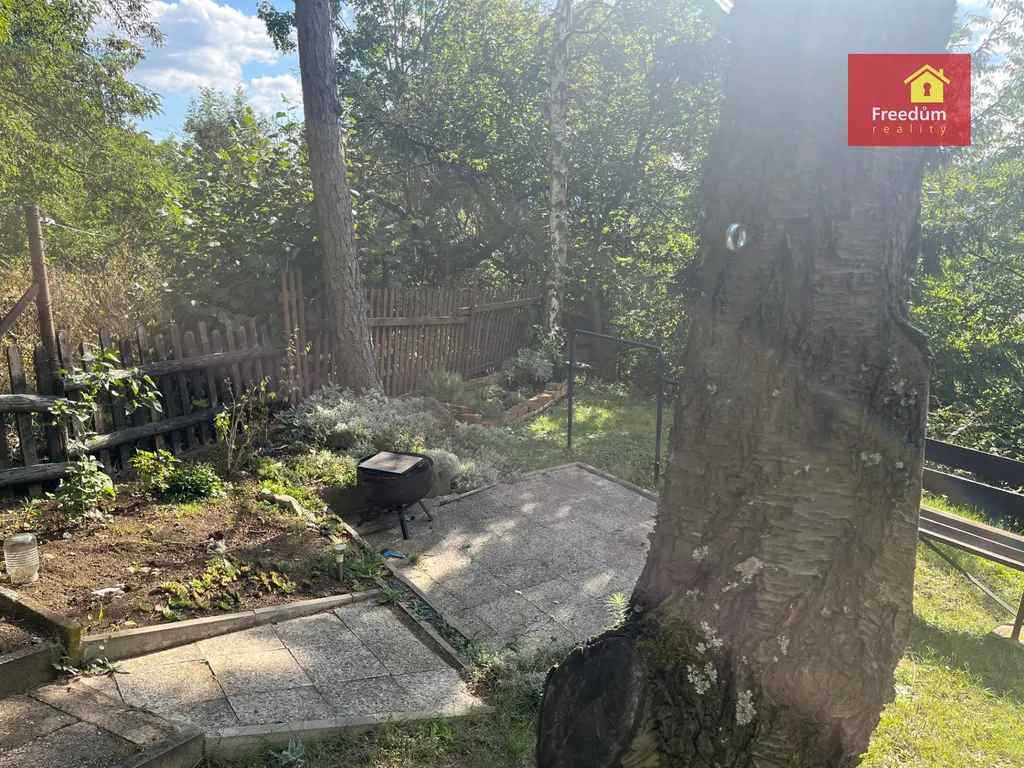 Dřevěná chatka o velikosti 22 m2 s úložným prostorem v podkroví. Zahráda je velká 648 m2.