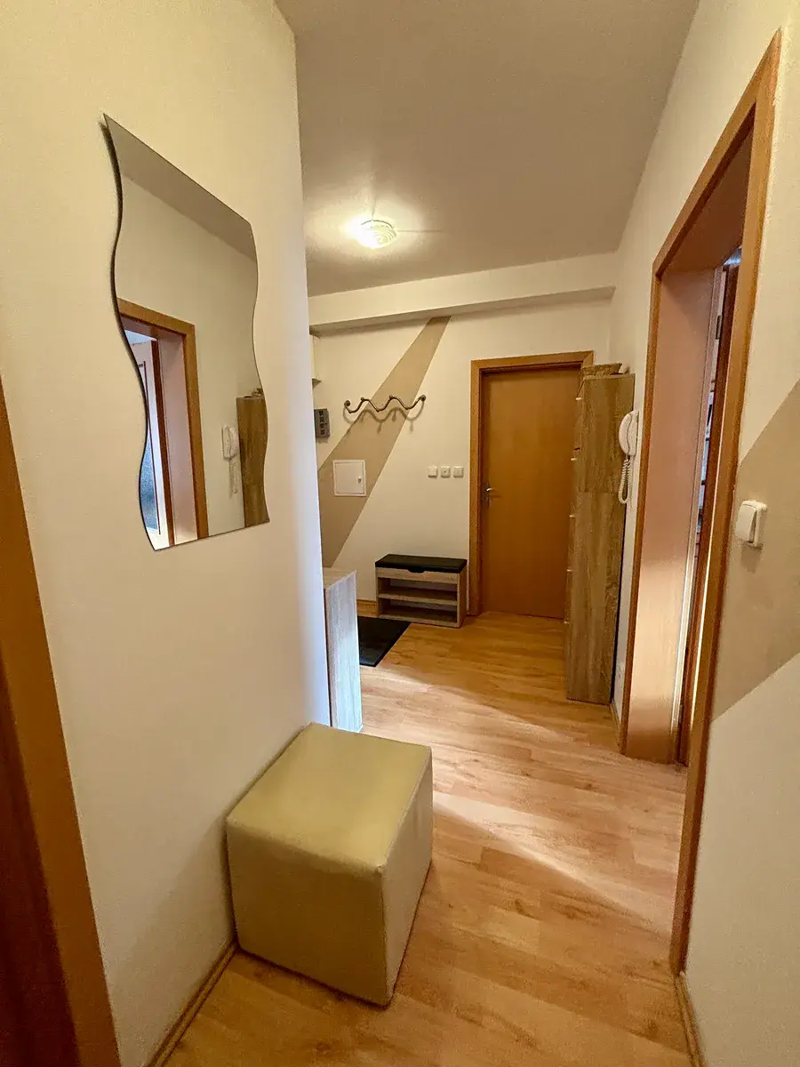 Bytová jednotka disponuje obývacím pokojem s kuch.linkou vybavenou vestavěnými spotřebiči - el. troubou, sklokeramickou varnou deskou, odsavačem par, lednicí s mrazákem, volně stojící myčkou nádobí, mikr.troubou, jídelním stolem se židlemi. V obýv. pokoji se nachází rozkládací sedací souprava, konf.stolek, obývací sestava skříní, stolek na počítač, v ložnici - manželské dvou-lůžko s kvalitními matracemi, šatní skříň, komody – viz fotografie. Z obýv.pokoje i z ložnice jsou vstupy na lodžie. Lodžie z ložnice je zasklená, což umožňuje její využití i v nepříznivém počasí nebo jako zimní zahradu. Byt je velmi světlý orientovaný na JZ, v bytě je dostatek slunečního světla. Okna jsou plastová s předokenními roletami, které zajistí soukromí, termoregulaci a úplné zatemnění. V chodbě jsou botníky, plynový kotel pro ohřev vody a vytápění. Koupelna s vanou se sprchovou zástěnou, pračkou, WC odděleně. Podlahové krytiny - obýv.pokoj s kuch. koutem, ložnice, chodba – plovoucí podlaha, koupelna, WC – dlažba. Bytová jednotka je připravena k nastěhování přelom ledna/února 2026, dle dohody.