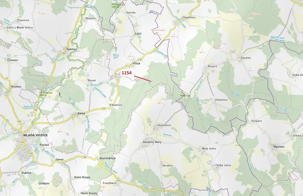 Lesní pozemek o výměře 2384 m2, parcelní číslo 1154, podíl 1/1, katastrální území Vilice, obec Vilice, obec s rozšířenou působností Tábor, okres Tábor, Jihočeský kraj. Po těžbě.