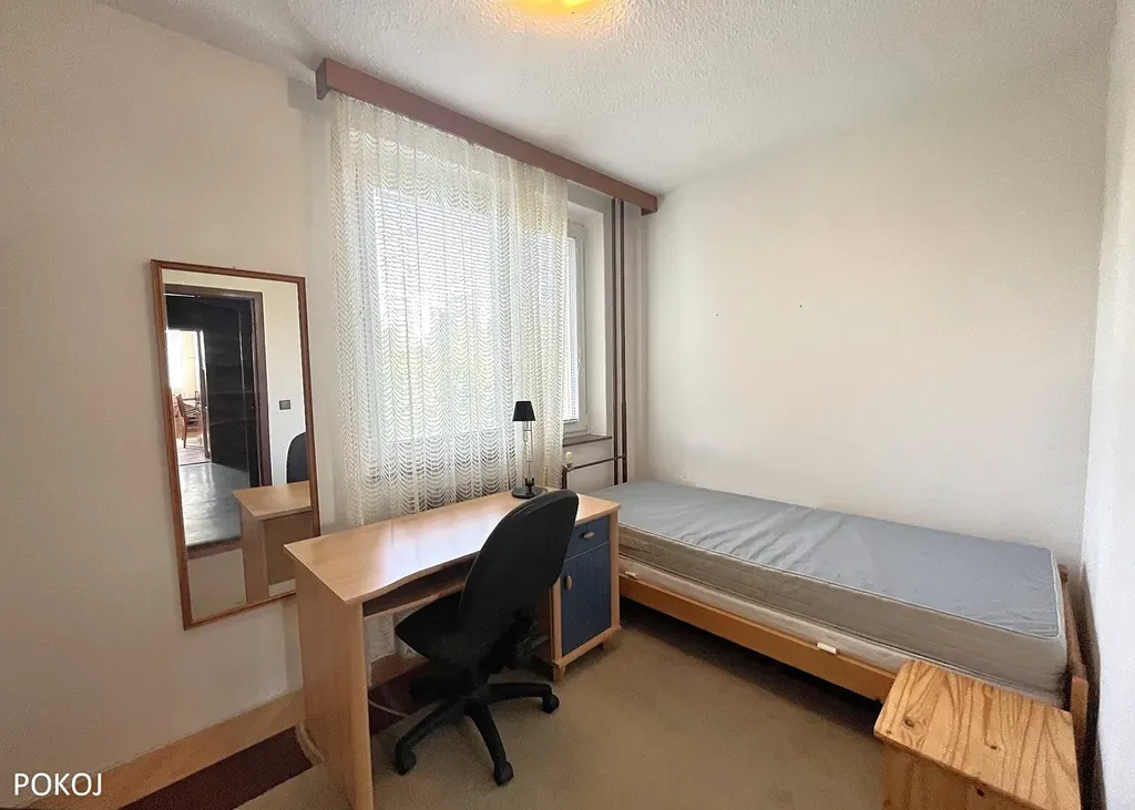 V pokoji je postel, psací stůl, komoda, zrcadlo, noční stolek a kancelářská židle.