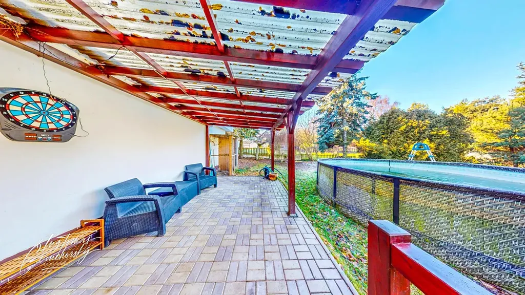 K domu náleží dvě prostorné terasy, které plynule rozšiřují obytný prostor směrem do zahrady. Jsou ideálním místem pro ranní kávu, klidný odpočinek i večerní posezení. Balkón orientovaný směrem k sousednímu pozemku slouží spíše jako praktický doplněk domu. Součástí pozemku je také bazén, který výrazně zvyšuje komfort bydlení a potěší zejména v letních měsících.