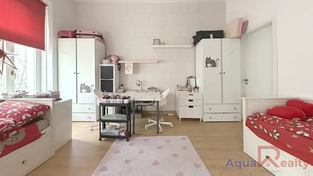 Byt o celkové ploše 82 m2 je díky své jihovýchodní orientaci po většinu dne zaplaven přirozeným světlem. Prostorný obývací pokoj s oddělenou kuchyňskou linkou tvoří přirozené centrum bytu ideální místo pro každodenní život i klidné večery. Další velký pokoj nabízí dostatek soukromí, zatímco menší pokoj je vhodný jako pracovna, pokoj pro hosty či klidná ložnice. Část bytu orientovaná na sever poskytuje příjemný klid i v letních měsících.
