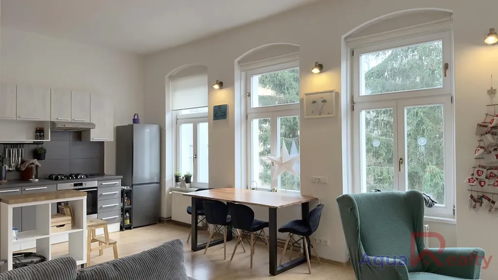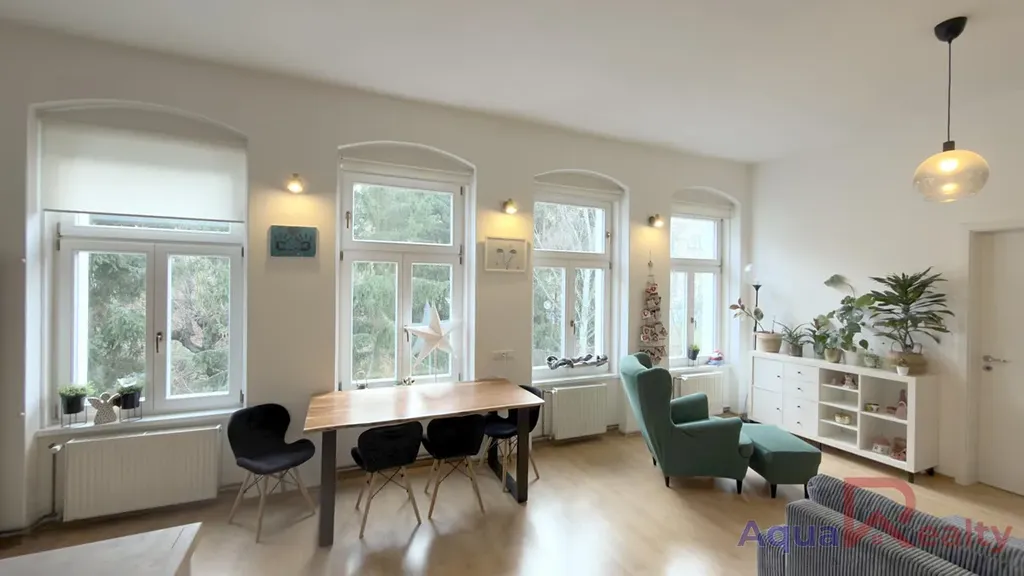 Interiér prošel citlivou a kvalitní rekonstrukcí, při které byl kladen důraz na detail a harmonii prostoru. Dřevěná okna, nové podlahy, hladké omítky a vysoké interiérové dveře podtrhují elegantní atmosféru bytu. Kuchyň je vybavena moderní kuchyňskou linkou včetně myčky. O každodenní komfort se stará ústřední topení s deskovými radiátory a plynový kondenzační kotel pro ohřev teplé vody.
