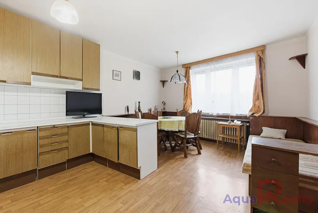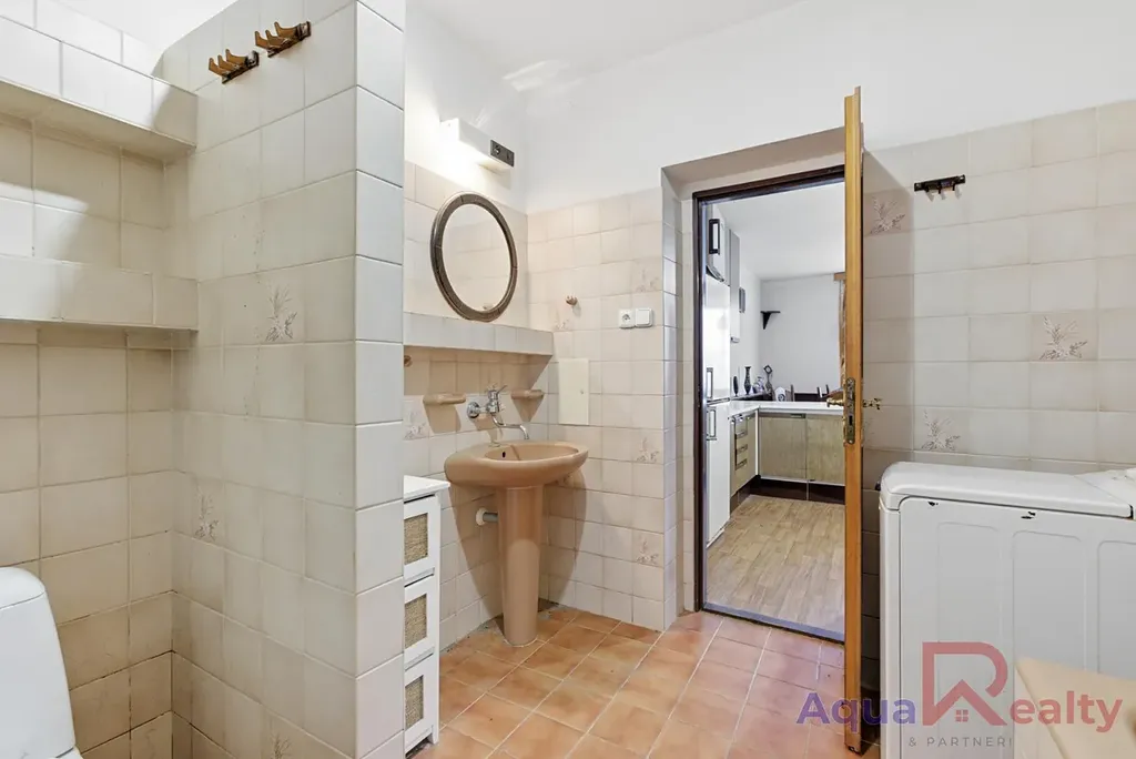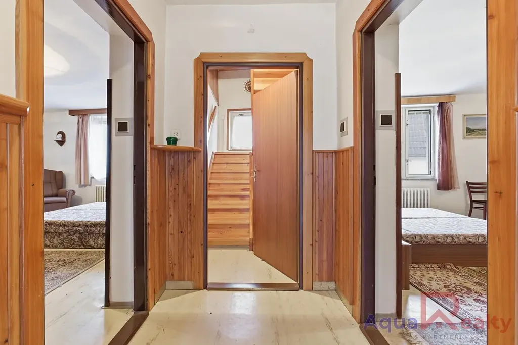 Nemovitost je v původním, udržovaném stavu bez předchozích rekonstrukcí. Interiér s dřevěnými okny, původním vybavením a podlahami z PVC, dlažby a korku čeká na modernizaci podle vašich představ. Technické zázemí zahrnuje vytápění plynovým kotlem, které je nově doplněno o krb, ohřev vody bojlerem a napojení na veřejný vodovod i kanalizaci. Rozvody elektřiny jsou původní hliníkové a fasáda domu je z břízolitu.