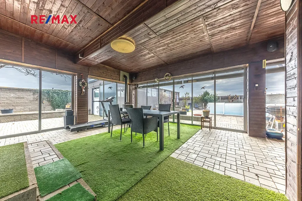 Zimní zahradou, která poskytuje ideální místo pro celoroční odpočinek. Užijete si v ní ranní kávu nebo večerní posezení, ať je venku jakékoliv počasí.
