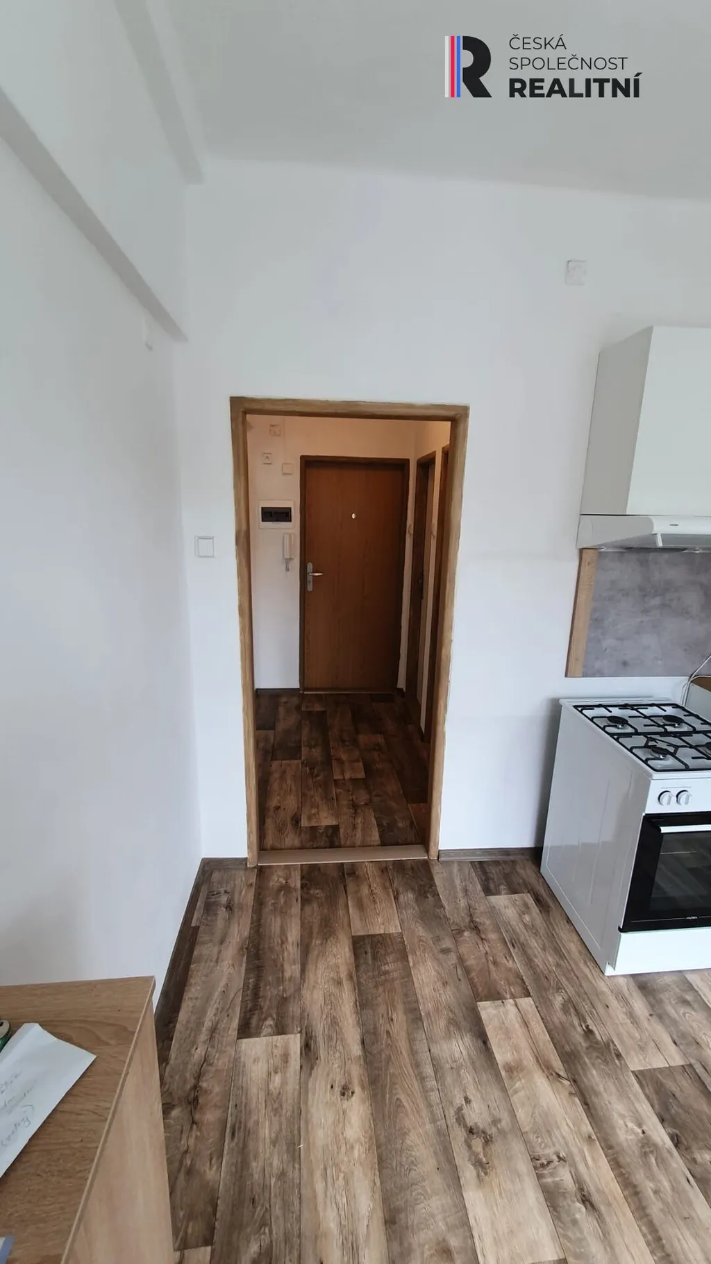 Byt disponuje samostatnou kuchyní s kuchyňskou linkou, plynovým sporákem a digestoří. Součástí je také oddělené WC, koupelna, předsíň s úložným prostorem a vestavěná skříň. Podlahy jsou řešeny moderním PVC v dekoru dřeva. Byt působí čistě a prakticky, připravený k okamžitému nastěhování.