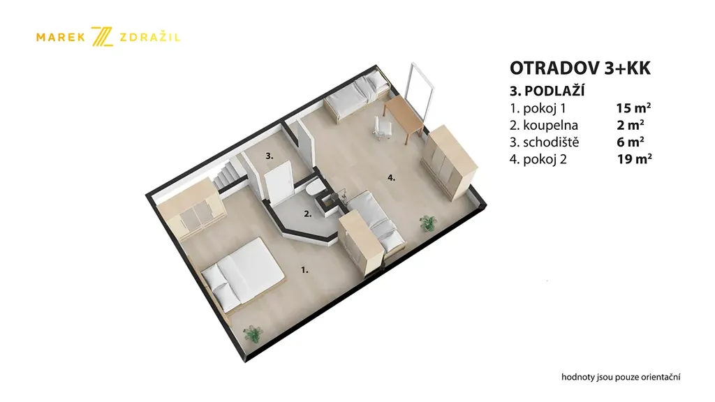 2. patro: dvě neprůchozí místnosti, sprchový kout a toaleta – vhodné jako ložnice, pracovna nebo pokoj pro hosty.