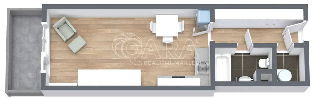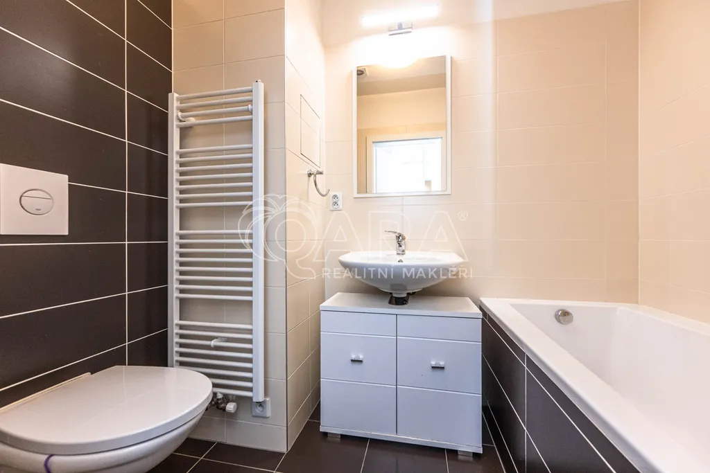Koupelna je osazena vanou, pračku pak najdete v samostatné technické místnosti, kde je také umístěn bojler na ohřev vody. Vytápění bytu je zajištěnou centrálně a formou radiátorů. Tolik potřebně úložné prostory jsou řešeny velkorysou vestavěnou skříní umístěnou v chodbě. Samotný obytný prostor pak může dýchat a nemusíte řešit další zbytečné komody či skříně.