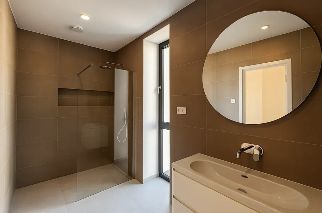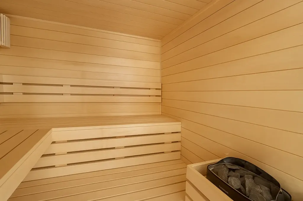 Koupelny jsou vybaveny prvky značek Laufen, Hansgrohe a Zehnder, doplněné volně stojící vanou Reduta. V hlavní koupelně navíc potěší sauna z osikového dřeva s prosklenými dveřmi a jemným LED podsvícením – ideální únik po dlouhém dni.