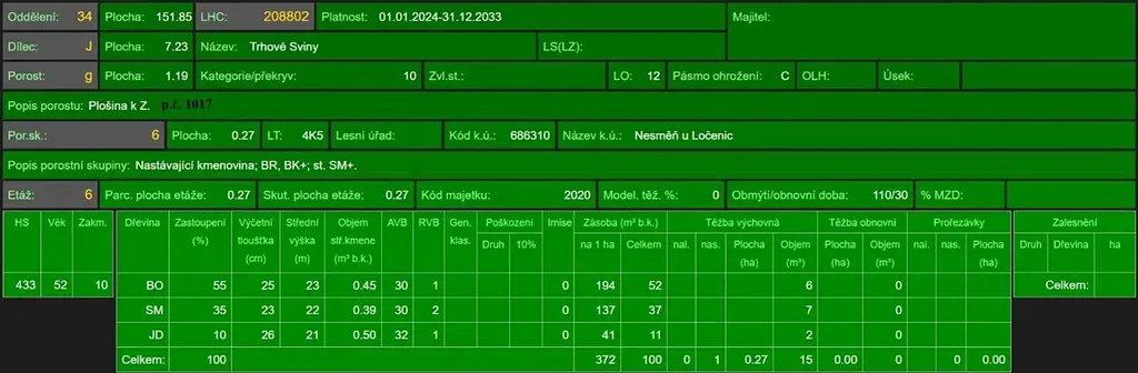 - p.č. 1017 vedená jako lesní pozemek o výměře 11 790 m2 (stáří lesa 147 let - zastoupení dřevin borovice, stáří lesa 53 a 37 let - zastoupení dřevin smrk, borovice, buk, jedle)