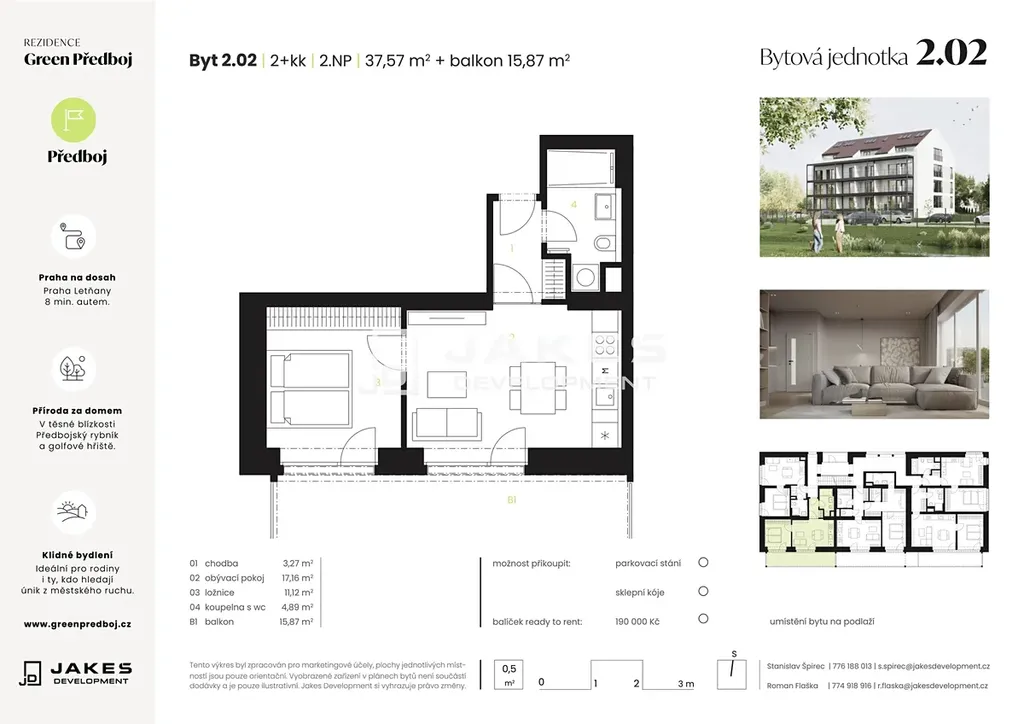 Nabízíme k prodeji byt 2+kk o velikosti 37,57 m² s balkonem o velikosti 15,87 m2 ve 2. nadzemním podlaží Rezidence Green Předboj. Byt bude dokončen ve vysokém standardu – kvalitní vinylové podlahy, moderní interiérové dveře a elegantní koupelna s keramickým obkladem a sanitou značky Laufen. Komfort zajišťuje podlahové vytápění, které přispívá k příjemné atmosféře i nízkým provozním nákladům.
