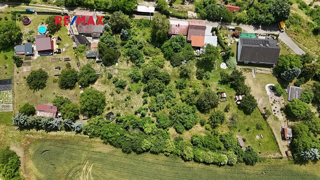 U příjezdové cesty na dolní hraně pozemku stojí malý domek s číslem popisným, který je ve fázi stavby nového domu možné využít jako zázemí staveniště a po dokončení stavby využít jako skladový prostor, základ pro novou garáž, případně jiným způsobem dle uvážení nového majitele.