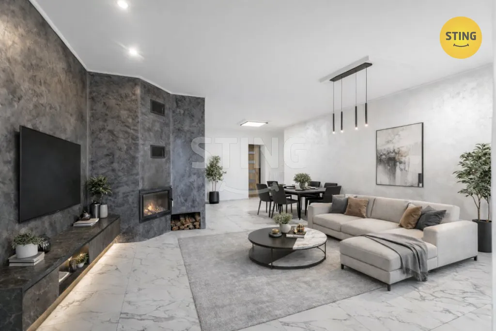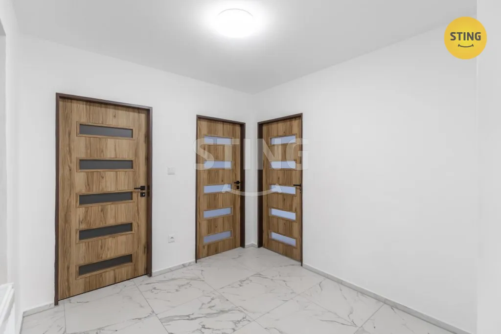 Rodinný dům i bytová jednotka prošly kompletní rekonstrukcí v roce 2025, díky které je nemovitost připravena k okamžitému a komfortnímu užívání. Interiér nabízí prostornou vstupní chodbu, velkorysý obývací pokoj s krbovou stěnou, dva samostatné pokoje a menší místnost, vhodnou jako pracovna nebo komora.