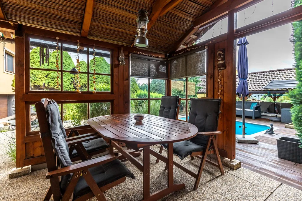 - Pergola s venkovním krbem ideální pro letní posezení