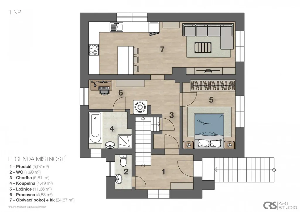 - Prostorný obývací pokoj s kuchyňským koutem, tři ložnice