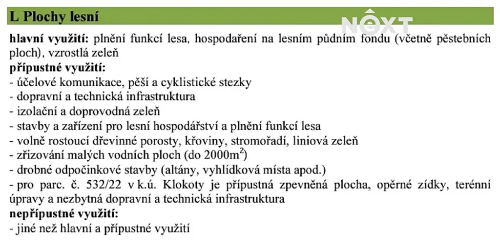 o celkové výměře 19 600 m2 v k.ú. Klokoty, Tábor, Obec Tábor, okres Tábor. V územním plánu určeno pro L Plochy lesní. Hlavní využití: plnění funkcí lesa, hospodaření na lesním půdním fondu (včetně pěstebních ploch), vzrostlá zeleň
