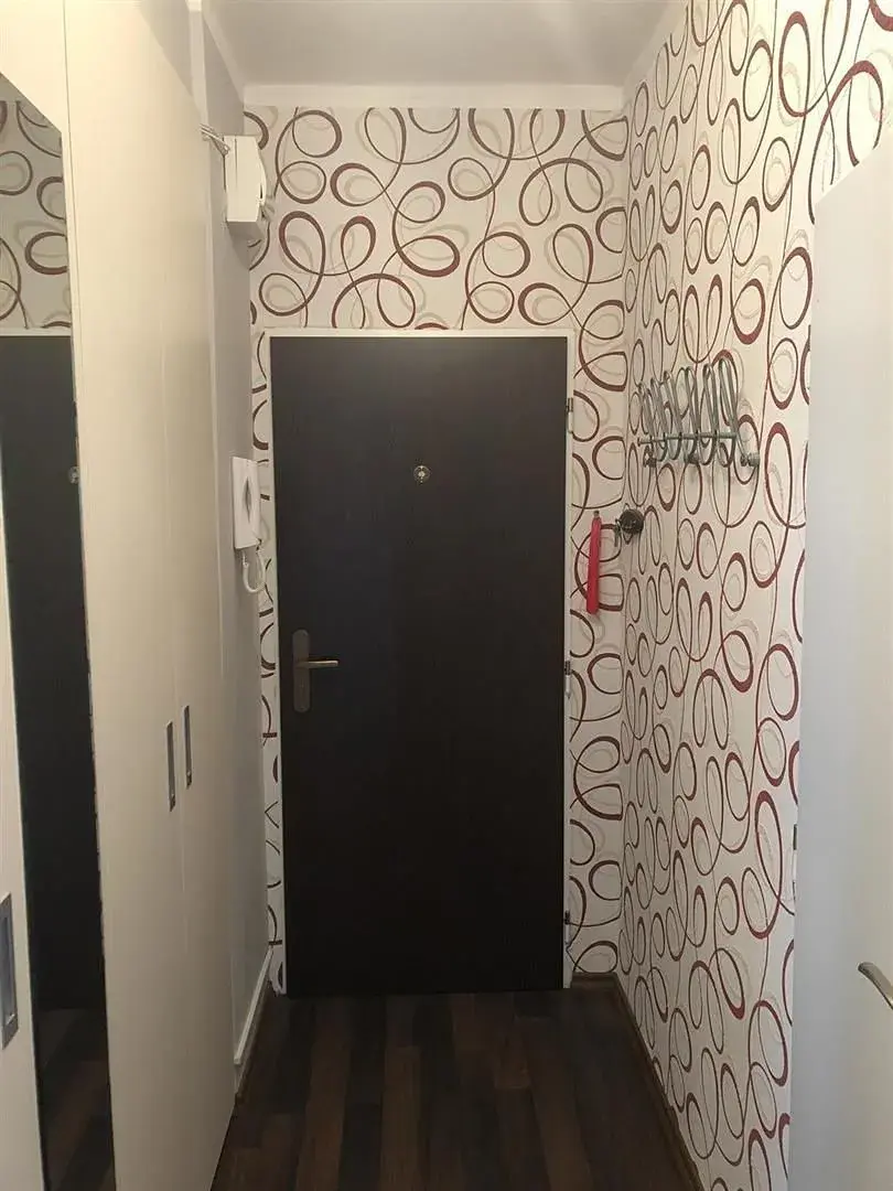 Dispozice: předsíň s velkou vestavěnou skříní, koupelna se sprchovým koutem a WC, vlevo obývací pokoj s kuchyňským koutem, vpravo ložnice s balkonem.