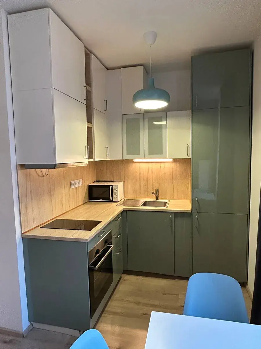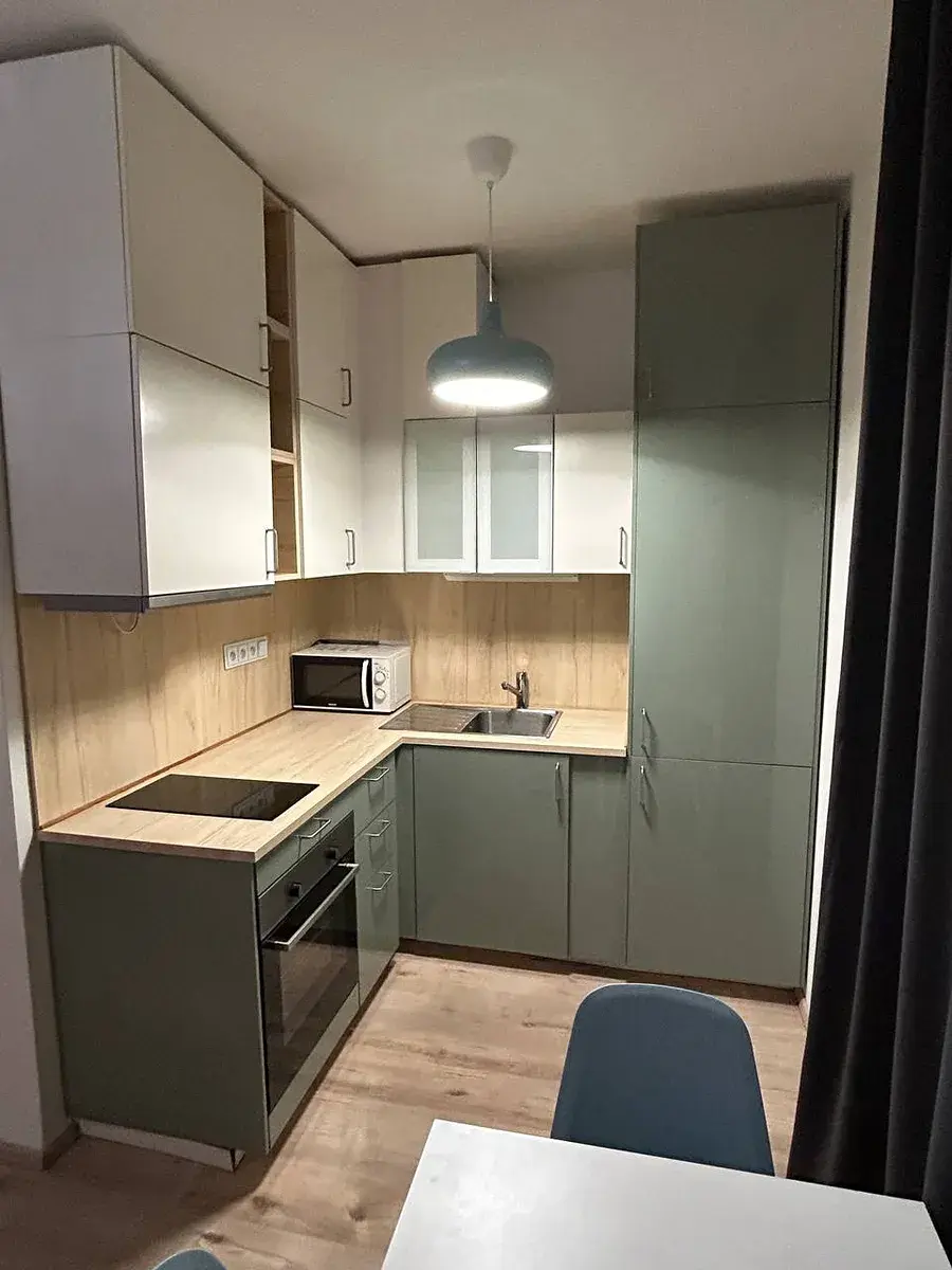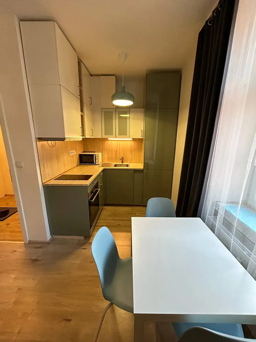 Byt je zařízený. Kuchyň je vybavená kuchyňskou linkou a elektrospotřebiči.