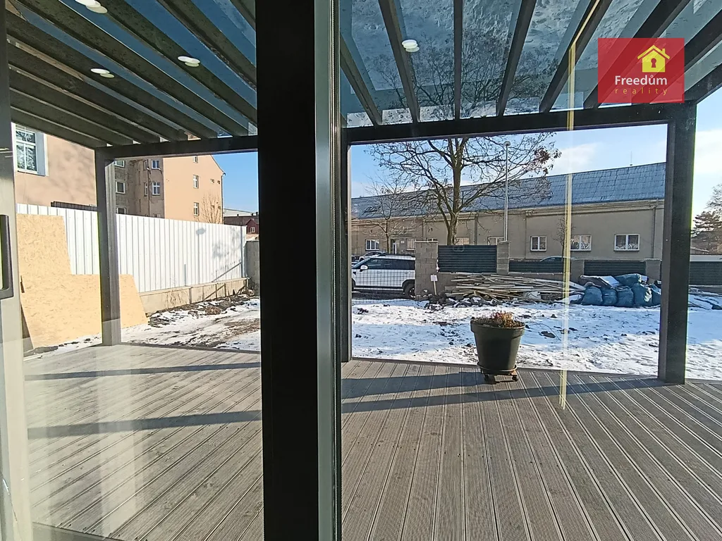 Terasa podél celého objektu je rozdělená na dvě částí, jedná z nichž je zastřešená.
