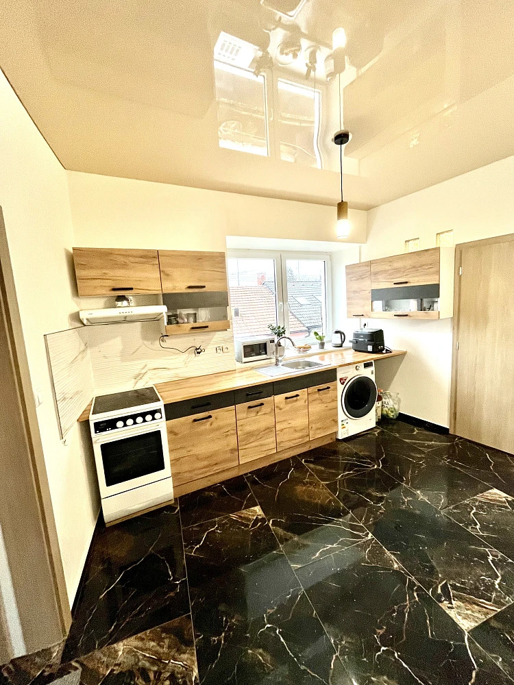 V kuchyni a v koupelně je i nová dlažba, v ostatních pokojích jsou zrenovované kvalitní dřevěné parkety.